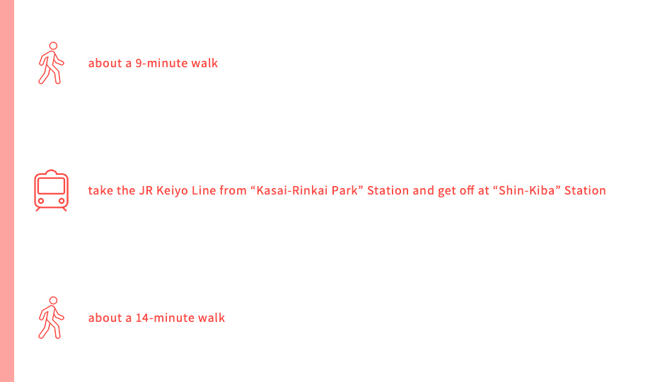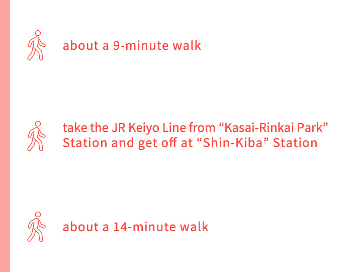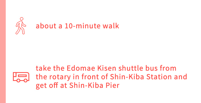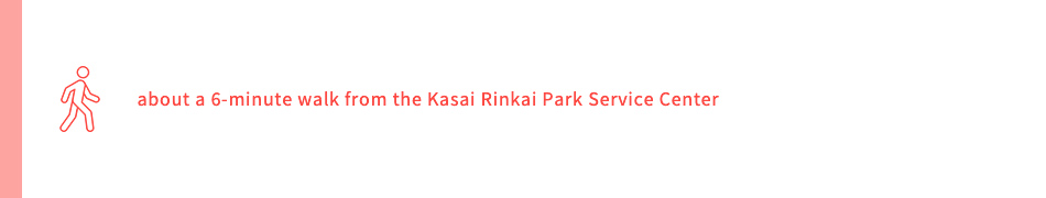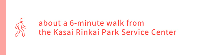 Start at JR Keiyo Line “Kasai-Rinkai Park” Station ➡ about a 3-minute walk ➡ Kasai Rinkai Park ➡ about a 6-minute walk from the Kasai Rinkai Park Service Center ➡ Observation Rest House “Crystal View” ➡ about a 9-minute walk ➡ take the JR Keiyo Line from “Kasai-Rinkai Park” Station and get off at “Shin-Kiba” Station ➡ about a 14-minute walk ➡ Tokyo Tatsumi Ice Arena ➡ about a 17-minute walk ➡ Yumenoshima Tropical Greenhouse Dome ➡ about a 10-minute walk ➡ take the Edomae Kisen shuttle bus from the rotary in front of Shin-Kiba Station and get off at Shin-Kiba Pier ➡ Edomae Kisen Monja Yakatabune Houseboat