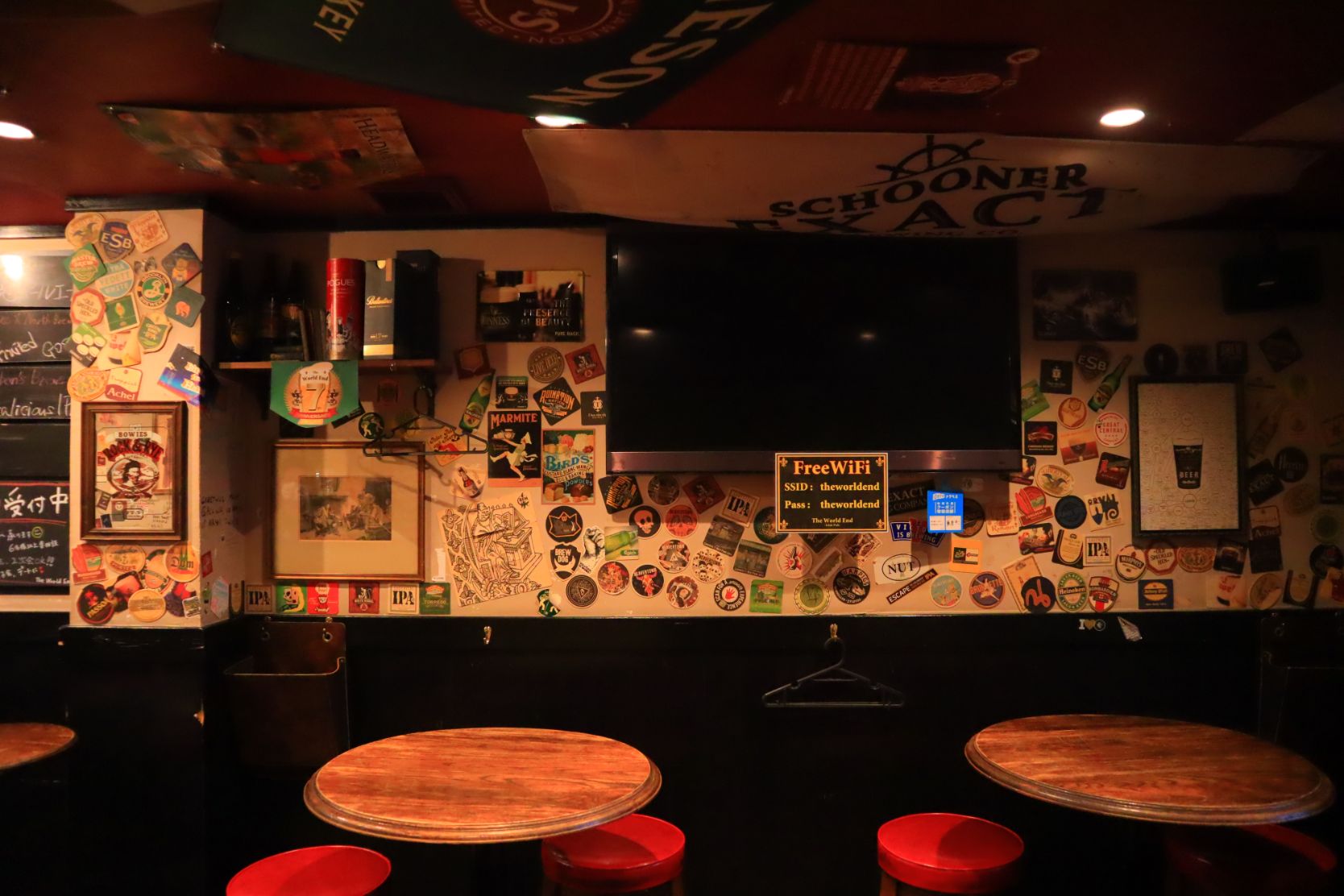 The World End Irish Pub, which opened in 2012, is a charming little bar that’s conveniently located right in front of Ueno Station—it’s just one minute away. You are greeted with a warm ambience and walls covered in stickers and coasters from a global array of beer brands. Red leather bar stools are dotted around the room, and the bar is positioned toward the back. A Jameson Irish Whiskey flag adorns the ceiling. The bar was opened by Shinya Kawai and his boss, after they spent time working in the popular British pub chain, HUB.