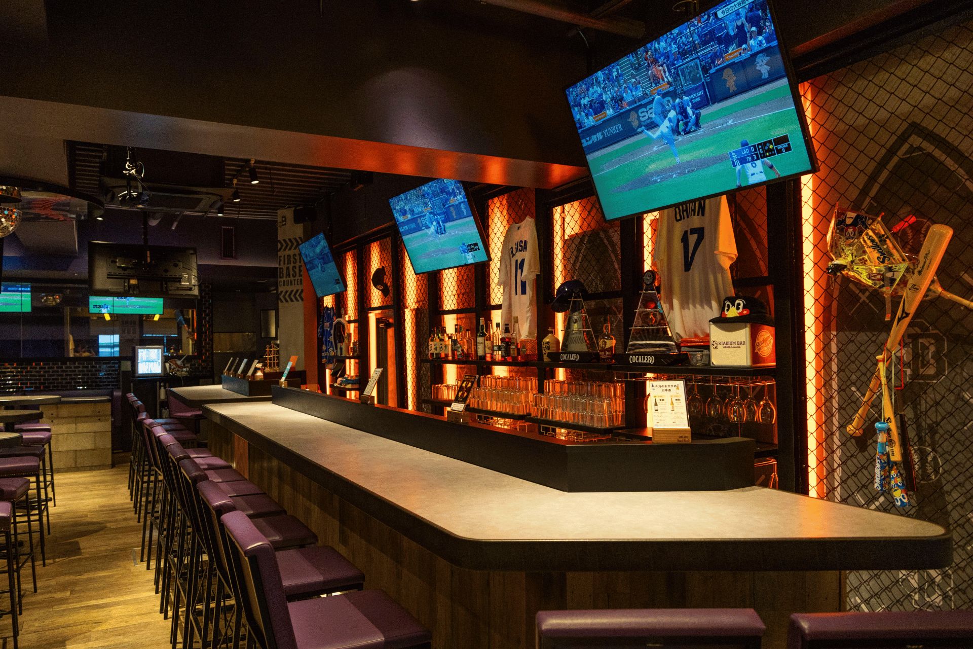 A sense of playfulness can even be seen in the seating arrangement, as the table seats are called “Infield Seats,” counter seats are labeled “S Seats,” and standing space is “General Admission.” In addition, there are special “Excite Seats” where you can feel the thrill of the game up-close, as well as a “Royal Box” where you can relax in VIP style. Inside the bar, in addition to Japanese professional baseball and Major League Baseball, soccer, Formula 1 and a wide range of other sports are shown. With numerous monitors and a giant screen, guests can enjoy the powerful experience of live sports viewing.