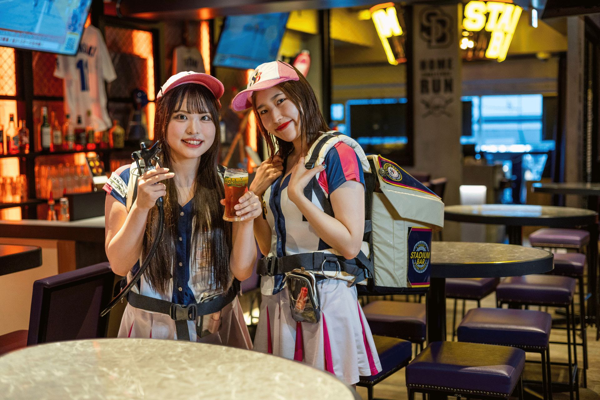 The most distinctive feature of STADIUM BAR Akiba League is that, just like in a real stadium, beer girls carrying kegs on their backs serve draft beer right at your table. Their lively smiles and freshly poured beer add to the excitement of the viewing experience.